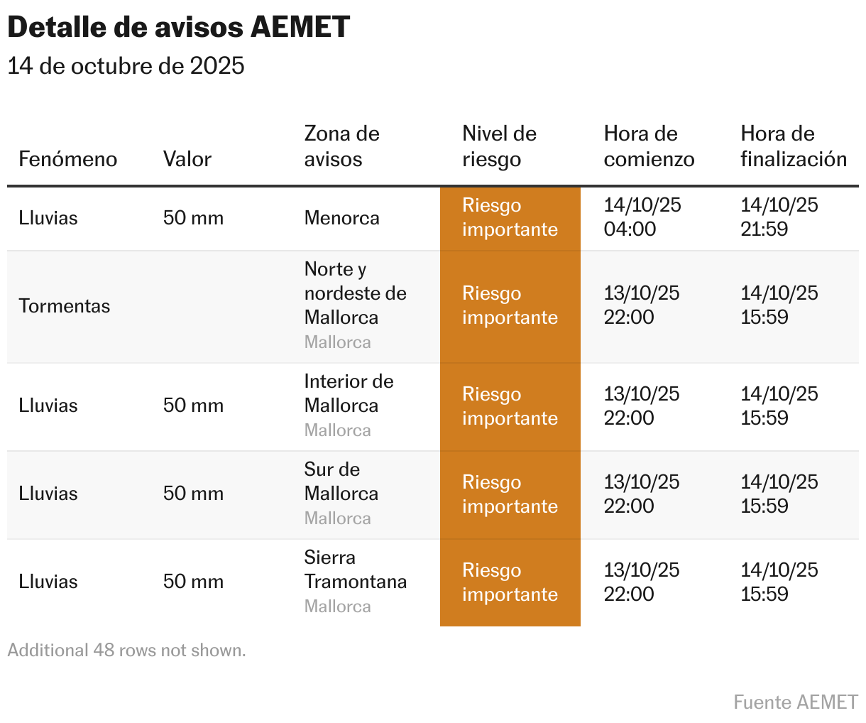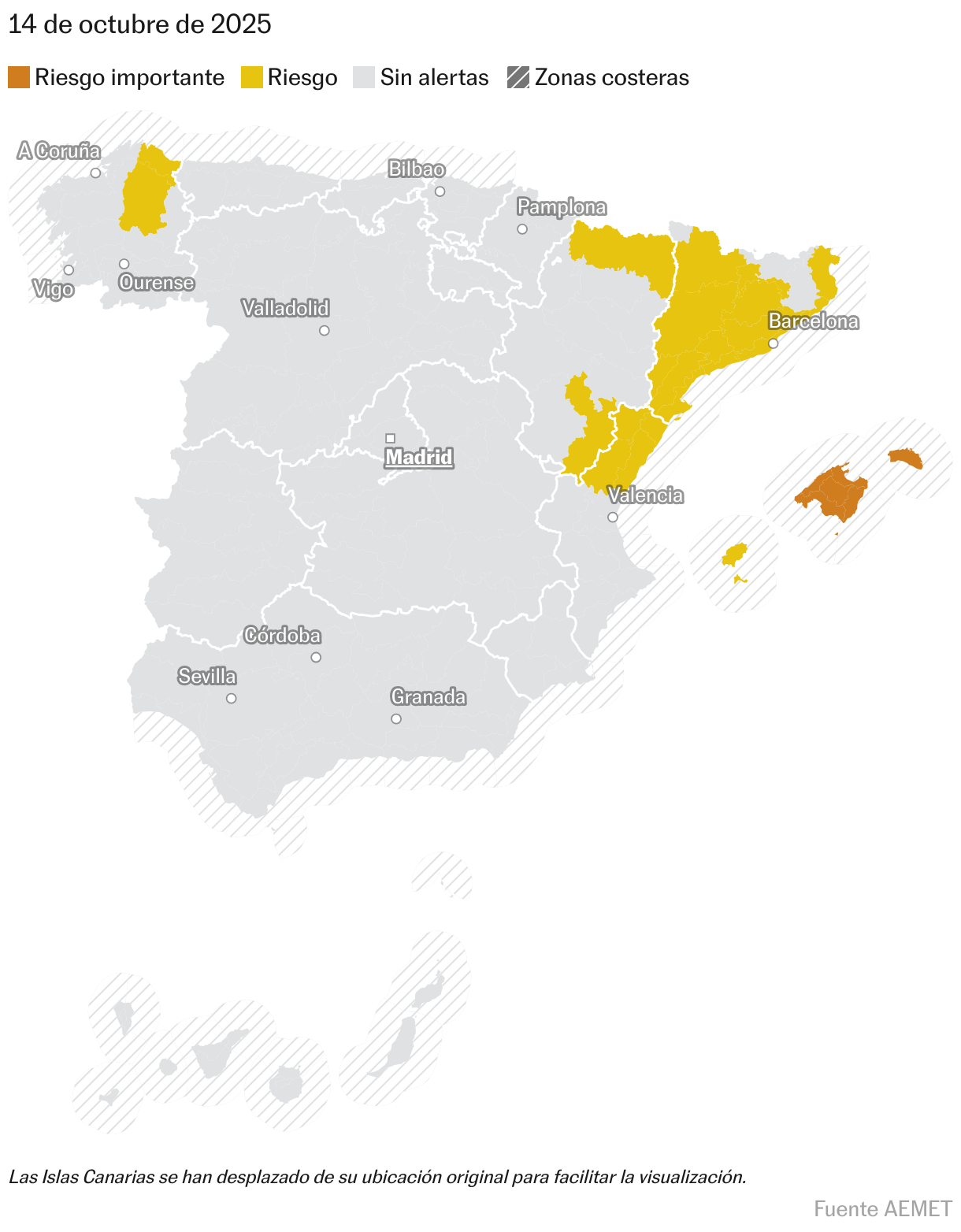 La Agencia Estatal de Meteorología (Aemet) prevé tiempo inestable en el este de la Península y Baleares para este martes. La entidad ha activado avisos naranjas en Mallorca, hasta las 18.00, y en Menorca, hasta la medianoche, por chubascos muy fuertes y persistentes. También se esperan chubascos y tormentas en el litoral peninsular, desde el norte de Alicante hasta Girona. La inestabilidad irá bajando en los próximos días, después de un fin de semana con numerosas incidencias en la Comunidad Valenciana, Cataluña e Ibiza debido al paso de la dana Alice.