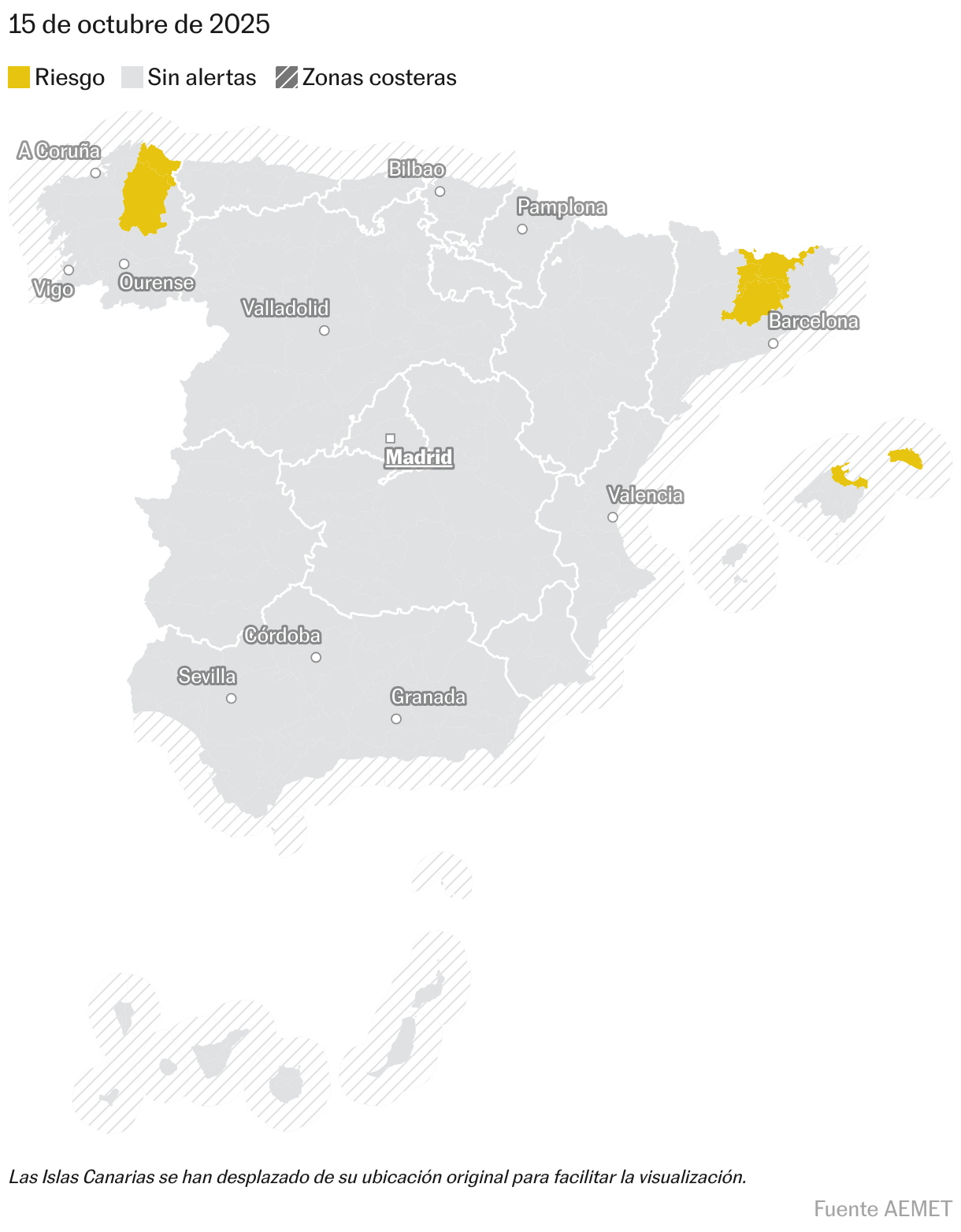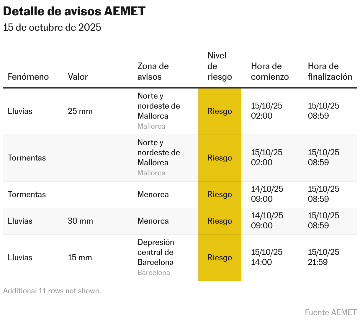 Vuelve el tiempo estable a casi todo el país, tras estos días de avisos naranjas y rojos, inundaciones y daños materiales, especialmente en la Comunidad Valenciana, Cataluña, Murcia y Baleares. Este miércoles amanece con pocos avisos activos —solo algunos amarillos— en zonas de Galicia, Cataluña y Baleares. Según la Agencia Estatal de Meteorología (Aemet), lo más destacable será la posibilidad de lluvias intensas en el norte de Cataluña, sobre todo en los Pirineos, sin descartarlas en otras zonas de montaña, especialmente del este peninsular. Rubén del Campo, portavoz de la Aemet, asegura que “durante el resto de la semana va a predominar una situación de tiempo en general estable, aunque todavía podrán producirse precipitaciones en el área mediterránea y también se formarán tormentas en zonas de montaña fundamentalmente”.