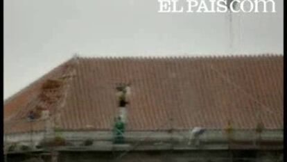 Sin casco ni arnés en el tejado de la iglesia
