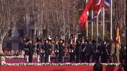 Ataviado con el uniforme de comandante del Ejército de Tierra, don Felipe llegó a la explanada del Palacio Real a las 10.30, acompañado por doña Letizia, y ha pasado a saludar a las autoridades, encabezadas por el jefe de Estado Mayor de la Defensa, general de Ejército Félix Sanz, el alcalde de Madrid, Alberto Ruiz Gallardón, y el vicepresidente de la Comunidad, Ignacio González.