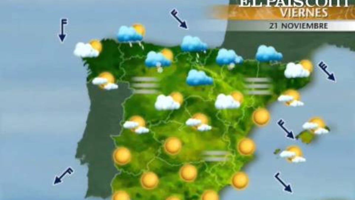 El viernes seguirá bastante nuboso en el extremo norte, con posibles lluvias en el Cantábrico oriental, que podrán extenderse al norte de Navarra. En el interior de la meseta norte la nubosidad tenderá a disminuir poco a poco. En el resto de la Península y en Baleares los cielos estarán despejados. En Canarias nubosidad variable, sin riesgo de lluvias. Las temperaturas no experimentarán cambios significativos.Vídeo: VNEWS