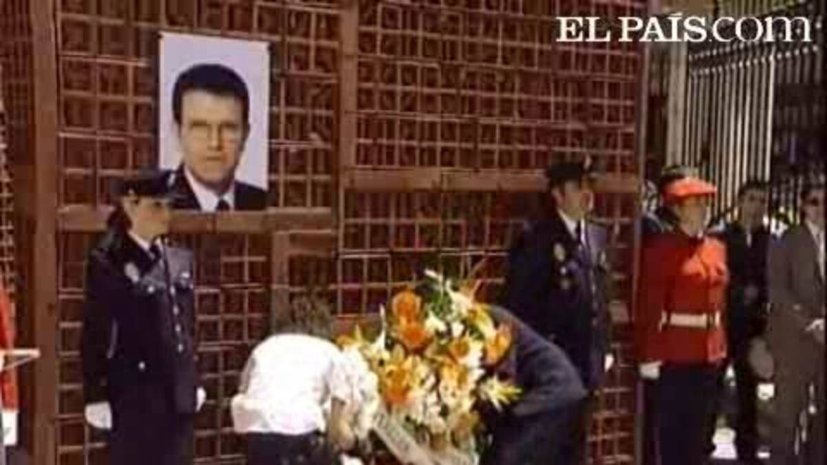 Los hijos del inspector asesinado han colocado una corona de flores bajo su fotografía, colocada en la escultura que rinde homenaje a todas las víctimas del terrorismo en el exterior de la Cámara, donde ondean a media asta la ikurriña, la bandera española y la europea. La presidenta de la Cámara ha entragado a la viuda, Paqui Hernández, un ejemplar de la declaración formal aprobada an la Cámara.