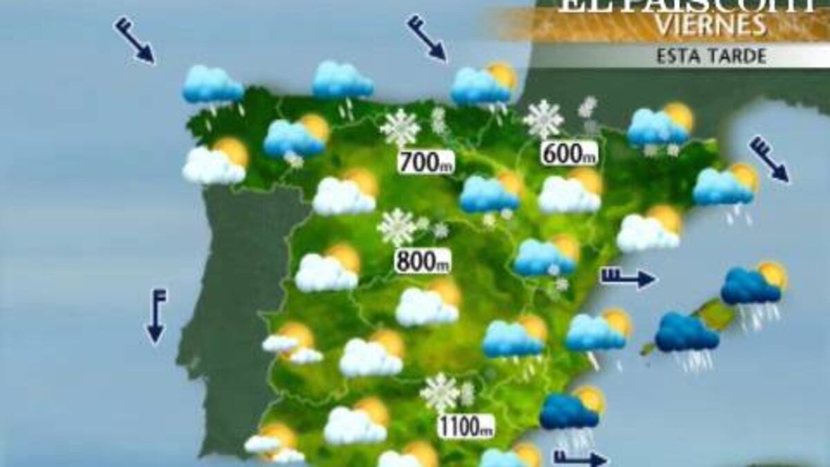 Para el día de hoy se esperan precipitaciones en toda la mitad este de la Península y en el tercio norte, donde además puede nevar en cotas de 600 m.
