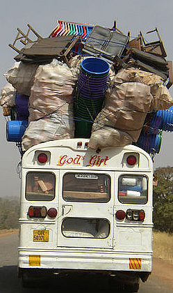 En Senegal los autubuses también van "hasta los topes" de pasajeros, muchos de ellos con medio cuerpo fuera del vehículo. Los curioso no fue sólo eso sino que presencié una vez que el conductor arreglaba un pinchazo sin que nadie bajase del bus!!. Medio ladeados al estar el autobus elevado por el gato, muchos pasajeros miraban indiferentes como arreglaba la averia sin que nadie se apease a auxiliarle