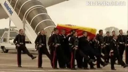 Familiares de los fallecidos recibieron el avión de la Fuerza Aérea Española a pie de pista, en el que viajaba la ministra de Defensa, Carme Chacón. Los féretros fueron bajados a hombros y recibidos con honores antes de procederse a un responso.