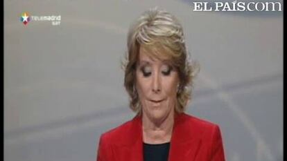 La presidenta se ha convertido en un verso suelto en su partido, como ella misma reconoce, pero sigue a rajatabla la estrategia del PP nacional de presentar las próximas elecciones como un plebiscito por eso dedicó buena parte de su tiempo a atacar al Ejecutivo socialista. Recordó con insistencia que el paro en España alcanza el 21%. Aguirre ha resultado repetitiva en sus argumentos. Llevaba una carpeta repleta de gráficos y recortes de periódicos, pero por momentos recordó el mismo debate de hace cuatro años cuando se refugió en las cifras. No existe Aguirre sin lapsus. Durante un momento de su intervención se refirió a Gómez como su "señoría", aunque el candidato socialista aún no es diputado.