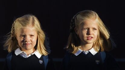 Las infantas Leonor y Sofía han comenzado hoy sus clases. Vestidas con el informe del colegio Santa María de los Rosales, privado y laico, llegaron al centro felices acompañadas de sus padres, los Príncipes de Asturias. Leonor incluso respondió a los periodistas cuando la preguntaron si tenía ganas de comenzar. "Sí". Su voz sonó muy tímida y su madre la instó a que hablara más alto. Luego la infanta contó que este año estudiaría "segundo de Primaria". Sofía empieza hoy el tercer curso de educación infantil.