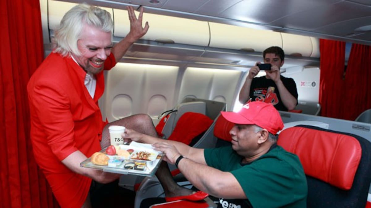 El dueño de Virgin paga una apuesta trabajando como auxiliar de cabina Todo ello durante el trayecto entre Perth y Kuala Lumpur de una aerolínea de la competencia