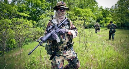 “¿Me estás diciendo que también os entrenáis para una posible invasión de zombis?”,pregunto con cara de estupor a Mike Lackomar, portavoz y uno de los líderes de la Milicia de Michigan. “Desde luego, y da igual que sea un zombi o un reptiliano”, responde con severidad. “Hay que buscar el cuerpo a cuerpo y meterle dos tiros en el pecho y otro en la cabeza, como en Vietnam”. Y se ríe a carcajadas. Pero no se ríe porque me esté reconociendo, con toda seriedad, que sus chicos se preparan en los bosques de Michigan para detener hordas de muertos vivientes, sino de la supuesta gracia que acaba de hacer. ¿Que no la han cogido? Yo tampoco, así que Lackomar la aclara: “Como en Vietnam –sonríe–, donde había que ganarse los corazones y las mentes de la población. ¡Pues eso, dos tiros en el corazón y uno en la mente! Si un zombi sangra es que se le puede matar”. Estamos en un parque natural a unos cien kilómetros al sur de Detroit. Es sábado. A nuestro alrededor hay ciclistas, gente haciendo footing,aprendices de ornitólogos con sus prismáticos y familias enteras preparándose para pasar un día de campo. Unos 20 milicianos vestidos con traje de camuflaje y armados hasta los dientes comienzan, a su lado, una incursión en supuesto territorio enemigo. Bubba, el alias de Tom, un ingeniero agrónomo que hoy hace las veces de jefe de equipo, les da las últimas instrucciones: si escuchan un drone, les dice, el motor de un avión espía, deben esconderse entre los árboles. Estamos en el aparcamiento del parque, junto a varios corredores que estiran sus músculos preparándose para salir a hacer deporte, pero Bubba acaba su charla de motivación mirándoles con expresión dura y les suelta: “Si alguno es capturado o herido, que no espere rescate”.