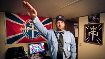 “La esvástica acojona…”. Schoep tiene cara de niño bueno y una atildada presencia. Habla pausado y escogiendo sus palabras. Su discurso es afable, medido, hasta contenido. Jeff está convencido de que la raza blanca en Estados Unidos se está convirtiendo en una minoría. Su apellido es de origen alemán. Lo dice sin preguntarle, como orgulloso de su supuesta ascendencia aria. No quiere decir cuántos miembros son, pero en sus propios vídeos se adivina que a las manifestaciones apenas acude medio centenar. Según las estimaciones hechas por Jack Kay, el exrector de la Universidad de Michigan, “por cada miembro real de un grupo radical hay unos cien simpatizantes”.
