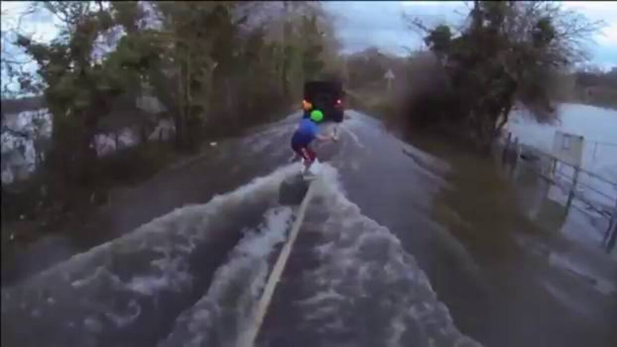 Tres jóvenes británicos se divierten sobre una tabla en una carretera inundada en Gran Bretaña