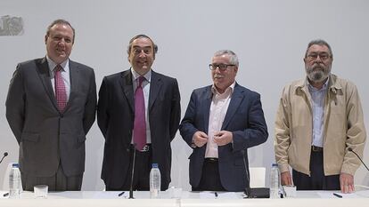 EL PAÍS ha reunido a los líderes de los sindicatos mayoritarios y de las patronales más representativas para analizar de qué forma España puede acercarse a Europa Participan: los secretarios generales de UGT, Cándido Méndez, y CC OO, Ignacio Fernández Toxo, y los presidentes de CEOE, Juan Rosell, y Cepyme, Jesús Terciado. Modera el periodista Manuel V. Gómez