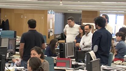 Alrededor de las nueve y media de la mañana llegaba la primera alerta: declaración institucional de Mariano Rajoy una hora más tarde en el Palacio de la Moncloa. Inmediatamente la maquinaria de la redacción se ponía en marcha para cubrir todos los frentes de una noticia que se anunciaba como de mayor calado que una remodelación de Gobierno, la primera idea de casi todos. El primer golpe lo paraba la web de elpais.com, pero la reacción no iba a quedar ahí. En menos de una hora no quedaba un ordenador libre. Todos los periodistas habían acudido a sus puestos de trabajo y, por supuesto, los que cubren información en Moncloa, Zarzuela y otros organismos ya estaban allí.