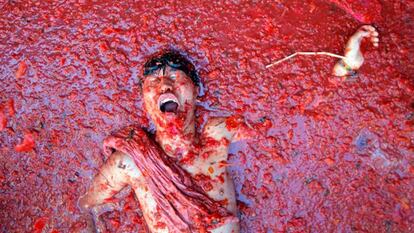 Son 140.000 kilos de tomate para 22.000 personas, pero por suerte no hay que comérselos. El último miércoles de agosto Buñol vive La Tomatina, una tradición que cumple 69 años y que empezó de la manera más improvisada: una pelea junto a un puesto de verduras. Los jóvenes del pueblo, irónicos, decidieron recordarla cada año desafiando la prohibición durante el franquismo. Y así hasta hoy: 80 medios nacionales e internacionales acreditados (con un programa especial de la BBC británica), el permiso a una productora de Hollywood para rodar una escena y dos macroconciertos para entretener en la víspera y esta noche a los asistentes. La de hoy ha sido la segunda Tomatina de pago. 17.000 personas han comprado una entrada por 10 euros para los gastos de organización y de paso impedir que se desborde el aforo. Además, entre los casi 10.000 vecinos de la localidad valenciana se reparten 5.000 accesos gratuitos. Entre los que han pagado, reinan los australianos (12.4%), mientras que la plata es para los británicos (11,79%) y el bronce para los japoneses (10.17%). Les siguen estadounidenses, españoles, indios, holandeses, alemanes, surcoreanos… y así hasta más de 16 nacionalidades. Todos acaban empapados en zumo de tomate y con algún que otro moratón como souvenir de la épica batalla de una hora.