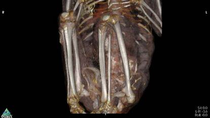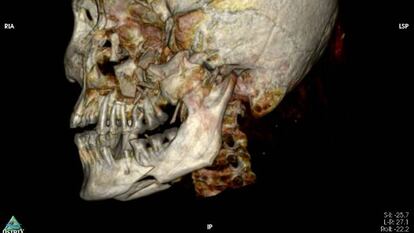 El TAC multicorte no debe su nombre a la casualidad. La momia, o lo que fuere, entra entera en el aparato y este lo despieza en unas lonchas muy finas de 0,35 milímetros de espesor. Juntas, conforman ese volumen en 3D que los investigadores pueden estudiar minuciosamente. "El análisis de los huesos da una enorme información. Por ejemplo, qué comió el sujeto, su altura o cuál era su condición física. Hasta podemos reconstruir los rasgos de su cara", indica Mena. Especialmente importantes son los dientes, porque de ellos ya puede deducirse "si es niño o niña, porque la dentición es distinta. Pero también su clase social, porque si la dentadura está en buen estado indica que se alimentaba bien". Todos estos datos puestos en común con los estudios antropológicos pueden desvelar mucha información tanto acerca de ese individuo en concreto como de la sociedad que habitaba. Hay momias que hasta conservan el peinado y aportan información sobre las modas estéticas de un periodo.