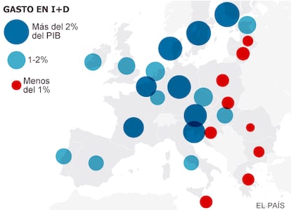 Pese al fuerte crecimiento de la inversión en I+D observado en España entre 2004 y 2009 —la primera parte del periodo tenido en consideración por la oficina estadística comunitaria— cuando pasó del 1,04% del PIB al 1,24%, la tendencia a la baja desde 2010 ha ensanchado la brecha respecto a la media europea (2,02% en 2013) y ha disparado el diferencial respecto a los países más avanzados de la UE y del resto del planeta. Corea del Sur y Japón, los líderes mundiales en inversión en I+D, cerraron 2011 (último año del que se disponen datos) en el 4,04% y en el 3,38% respectivamente. En 2012, EE UU invirtió el 2,81% de su PIB en esta partida y China el 1,98%, cifra solo superada por ocho países europeos.