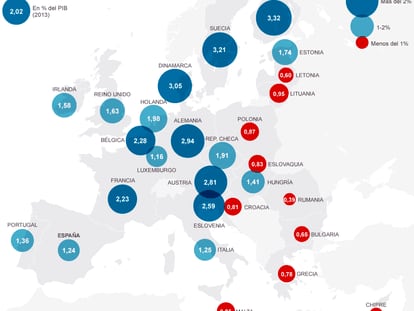 España sigue sin levantar cabeza en la clasificación europea de países por inversión en investigación y desarrollo (I+D). En la última década, este país ha pasado de ocupar la posición decimoquinta a quedar relegado al decimoséptimo lugar de entre los 28 Estados de la UE. Con una inversión anual del 1,24% del PIB, España se sitúa en el furgón de cola europeo y a una distancia abismal de los países que siguen liderando la inversión en I+D: los nórdicos —con Finlandia a la cabeza y todos ellos por encima del 3%—, Alemania (2,94%) y Austria (2,81%). Además, desde 2004, España se ha visto sobrepasada por otro país de su entorno que también ha sufrido los rigores de la crisis y de la austeridad en sus finanzas públicas: Portugal (1,36%).