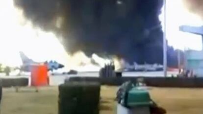 Son los segundos posteriores al desastre. Unas imágenes, aparentemente obtenidas con un teléfono móvil y distribuidas por la agencia Atlas, muestran la enorme columna de humo y llamas que ha seguido al accidente de un F-16 en la base militar de Los Llanos (Albacete). Mientras la megafonía del recinto avisa de que "se ha declarado una emergencia en vuelo", el vídeo recoge las reacciones de otras personas que se habían acercado a ver las maniobras de cazas de la OTAN, el ruido alejado de algunas explosiones, el paso de un vehículo de bomberos y las primeras sirenas. La aeronave siniestrada, perteneciente a las fuerzas aéreas griegas, ha impactado contra otras que estaban estacionadas al no lograr despegar de la pista. El primer parte oficial del accidente arroja un balance de 10 muertos y 13 heridos, seis de ellos de gravedad.