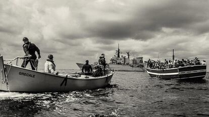 Nos había costado cerca de un mes de negociaciones llegar hasta allí. Un buen puñado de correos. En español, inglés e italiano, lengua que domina Spottorno. De cartas con membrete oficial de EL PAÍS a embajadas, mandos militares y miembros del gobierno. Finalmente sucedió cuando nos encontrábamos en Sicilia, saliendo del Cara di Mineo, el mayor centro de refugiados y solicitantes de asilo de Europa. Un lugar apocalíptico: 4.000 inmigrantes de más de 40 nacionalidades hacinados en una antigua urbanización para soldados estadounidenses destinados en la isla. A las puertas del centro leímos el correo electrónico de un teniente de la Marina: “Un helicóptero les transportará a bordo de la fragata Grecale. De momento la duración de este embarco no es definible”.