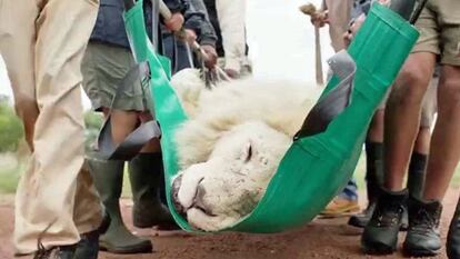 Una empresa de adhesivos para dentaduras paga implantes dentales a un león blanco, una especie protegida en Sudáfrica, que se había aislado de su manada al perder los caninos, lo que le impedía cazar y alimentarse