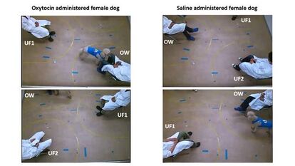 El equipo de científicos fue todavía más allá. En un tercer experimento, rociaron oxitocina en el hocico de algunos perros y los volvieron a meter en una habitación con su dueño y dos personas desconocidas. En los vídeos, puede verse cómo algunas mascotas se quedaban congeladas mirando a los ojos de sus dueños, que a su vez producían más oxitocina, en una cantidad correlacionada con la de sus animales.