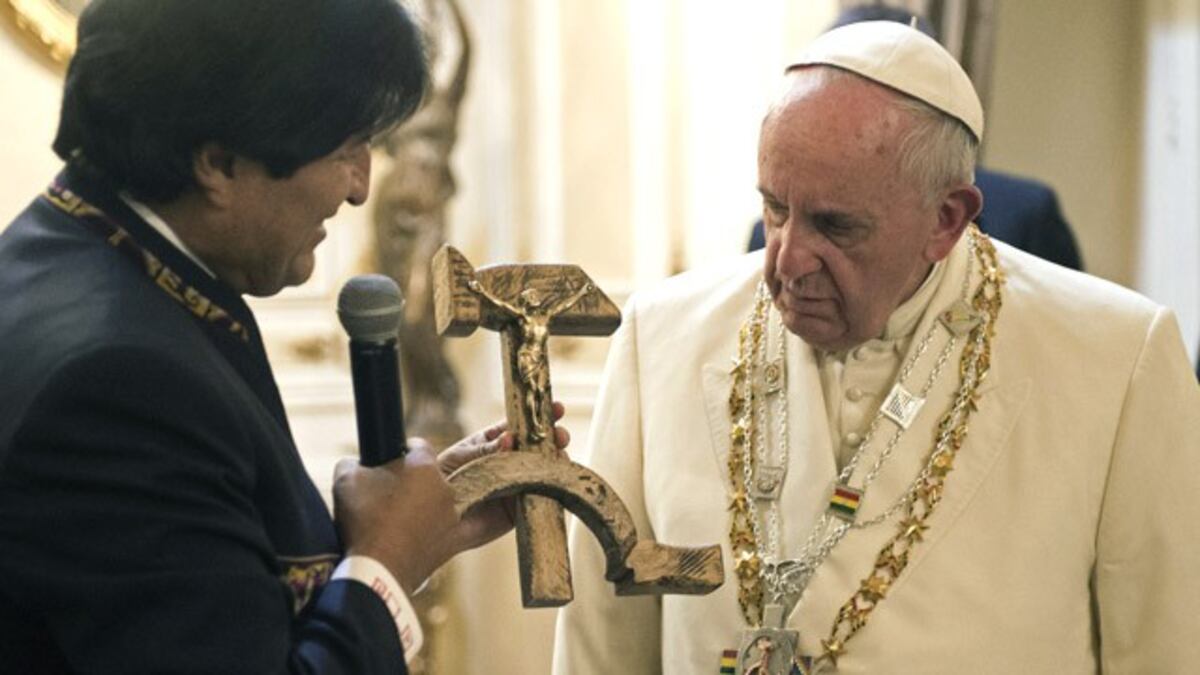 Francisco recorría varios países de America Latina en una esperada gira. En su parada en Bolivia, el pasado jueves, el presidente Evo Morales le hacía un sorprendente regalo: un crucifijo con forma de hoz y martillo
