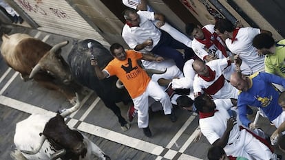 El séptimo encierro, el más rápido de San Fermín con dos mozos corneados