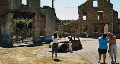 “¿Auschwitz? ¿Con billete de vuelta? ¿Desde el centro de la ciudad? Sí, es posible”, rezaba la campaña publicitaria de una compañía de autobuses de Cracovia. ¿Pero por qué solo ir de visita al Holocausto cuando, allá donde piso, piso una tumba y la capa de la Tierra me ofrece un sinfín de reconfortantes ocasiones de sentirme inocente e ileso? Así, Tézenas ha fotografiado el pueblo mártir de Oradour-sur-Glane (Francia), cuya población fue exterminada por los alemanes en 1944, en represalia por la emboscada y muerte de un capitán de su Ejército, y cuyas calles entre ruinas se constituyen en un memorial mudo por el que deambulan los visitantes mirando aquí un coche calcinado, allí una pared que se sostiene sola…