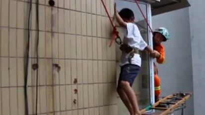 Los bomberos de la localidad china de Chongquing recibieron el aviso este domingo: un joven de 10 años estaba atrapado en el balcón de un edificio de cinco pisos. El niño salió de su casa sin las llaves y trató de acceder de nuevo al recinto por el balcón. Sin embargo, la puerta de la terraza también se encontraba cerrada y no podía volver a las escaleras del edificio, por lo que los operarios tuvieron que rescatarle colocando una escalera para que el joven pudiera salir del balcón.