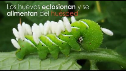 Pero lo que hace la Cotesia congregata es, siempre a ojos humanos, aún más retorcido. Las hembras de esta avispa de la familia de los bracónidos desarrollan partículas de un virus (bracovirus) en sus ovarios. En el momento de la puesta, inyectan tanto los huevos como el bracovirus en su huésped. El virus neutraliza el sistema inmune de la oruga para que no ataque a los huevos de la avispa. El final de la historia es previsible: los huevos eclosionan y se alimentan de ella hasta matarla.