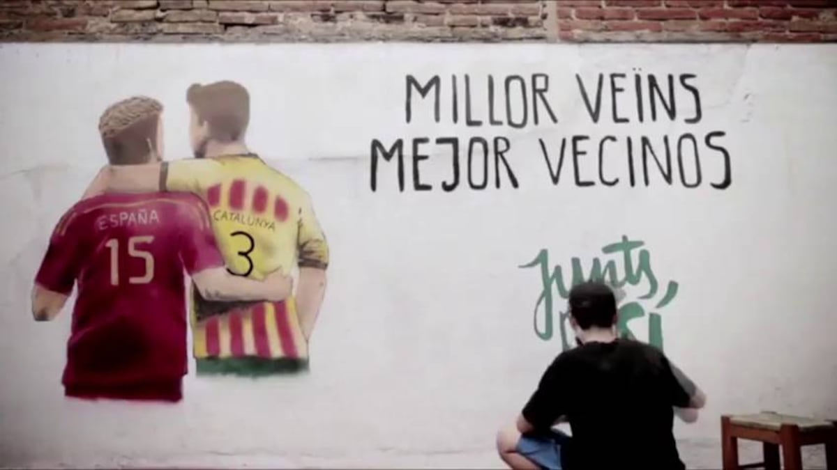 Gerard Piqué y Sergio Ramos han aparecido juntos en el último vídeo electoral publicado por la coalición soberanista Junts pel Sí. En las imágenes se muestra a un joven en un muro blanco haciendo una pintada de los dos jugadores abrazados, uno con la camiseta de España y el otro con la de Cataluña, junto al lema "Mejor vecinos". Este vídeo llega unas semanas después de que el jugador catalán fuera recibido con pitos en el campo y que, tras recibir éste el apoyo del resto de jugadores de la selección, Ramos rompiera la unanimidad de apoyo de sus compañeros para criticarle por "crear una polémica que perjudica al grupo". Como banda sonora, una canción que hace alusión a la escasez de becas y a la salida de los jóvenes al extranjero: "La mitad de los jóvenes, parados. Es el presente. ¿Quieres seguir igual o cambiar el futuro de tu gente? 17% de estudiantes, sólo un 8% de becas. Haz las cuentas. ¿Para ti qué ayudas quedan? Estás en casa de tus padres y de ahí no te mueves. ¿Cuándo te vas? En Suecia, a los 19, Aquí, a los 29. Si seguimos en España este es tu sino".