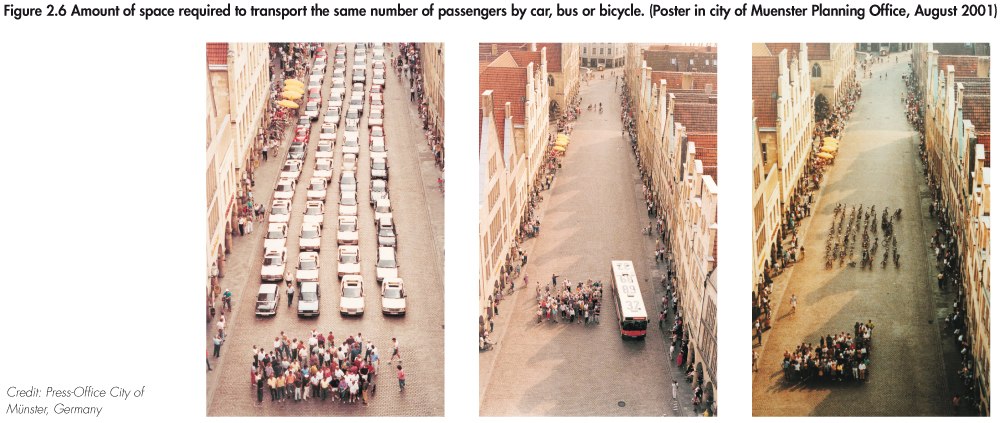 Esta fotografía refleja la cantidad de espacio requerido para transportar el mismo número de personas según el uso del coche, autobús o bicicleta, Muenster.