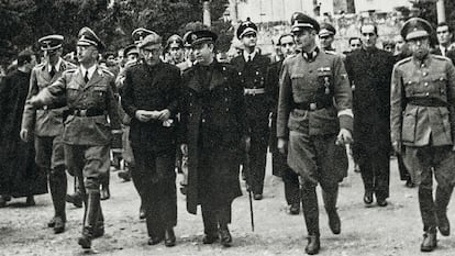 Fueron algunas de las paradas que realizó Heinrich Himmler cuando en octubre de 1940, días antes de que Hitler y Franco acabaran de rubricar su desconfianza mutua en Hendaya, visitó España durante tres jornadas intensas. Un aclamado itinerario que quedó recogido por el entonces Partido Nazi en un álbum de fotografías al que ha tenido acceso El País Semanal. Lo recopilaron lujosamente en un volumen como de libro de caballerías medieval, con letra gótica, y es uno de los documentos que la Fundación Castañé ha cedido a la Residencia de Estudiantes de Madrid, junto a otros referentes al franquismo y la Guerra Civil.