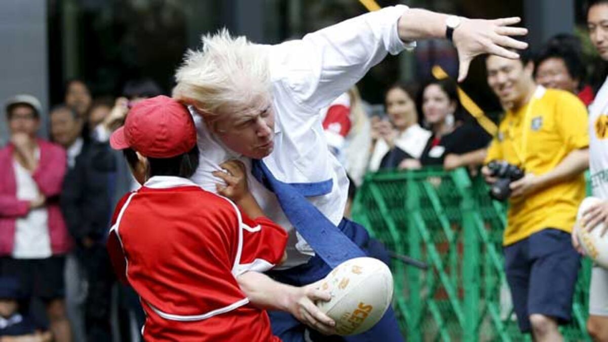 Boris Johnson derriba a un pequeño mientras ensayaba unas jugadas durante un acto en Tokio para promocionar el próximo mundial de rugby, que se celebrará en Japón en 2019