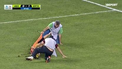 Los camilleros de un equipo de segunda división griega tiran al suelo dos veces a un futbolista