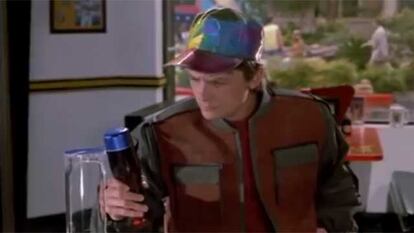 El futuro que predijo la segunda película de la saga Regreso al futuro ya es presente y parece que la imaginación de los guionistas fue más rápida que la realidad. Ya es 21 de octubre de 2015, el día al que viajaba Marty McFly y las calles no están llenas de patinetes voladores ni los bares, al menos la mayoría, están inundados de pantallas que nos atienden. Pero hay una cosa, al menos, que hoy sí se cumplirá. Pepsi Perfect es un refresco de cola envasado en una botella con el mismo diseño que se veía en la película. Es decir, como imaginaron en 1985 que sería tres décadas después. En total, la compañía estadounidense sacará a la venta en su web 6.500 unidades a 20 dólares cada una (17,60 euros). La estrategia comercial es uno de los casos más curiosos de la historia en lo que se refiere a emplazamiento publicitario, esa técnica que consiste en introducir marcas en la pantalla para que el espectador las capte más o menos subliminalmente. La campaña de lanzamiento ha incluido un anuncio que recrea la estética de la película y un eslogan que, en este caso, parecía fácil de encontrar: “El futuro es ahora”