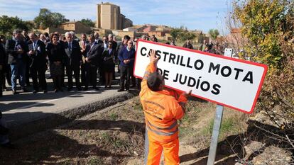 Casi un año y cinco meses le han costado a Castrillo Matajudíos cambiarse de apellido. Y este viernes da el paso definitivo. Este pueblo burgalés, de apenas 60 habitantes, oficializa este viernes su rebautismo como Castrillo Mota de Judíos. Aunque el Boletín Oficial de Castilla y León ya publicó en junio el acuerdo del Gobierno regional que aprobaba la denominación, el Ayuntamiento ha descubierto este mediodía el nuevo escudo de la población y ha colocado el cartel de la carretera que anuncia la llegada al municipio. "Vivimos una jornada histórica", ha señalado el Consistorio, que recibe este viernes a una amplia representación de las comunidades judía y sefardí, así como al embajador de Israel, Daniel Kutner.
