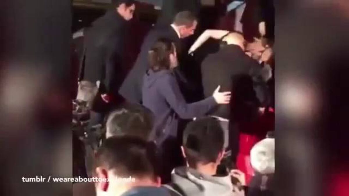 La actriz dio un traspié y acabó en el suelo durante el estreno de 'Sinsajo, parte 2', en Madrid. Recordamos las caídas de la intérprete en la entrega de los premios Oscar
