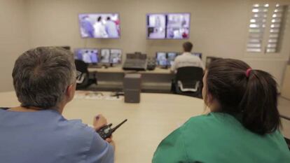 Pero la formación y la práctica de los profesionales no se queda sólo en la propia simulación. El 4DHealth desarrolla su propia metodología y el aprendizaje va más allá del “plató”. Con cámaras, micrófonos y pinganillos agazapados por todas las esquinas del hospital, cualquier movimiento o conversación queda grabado y recogido por el equipo audiovisual que controla los mandos en la sala de realización. La estancia, llena de pantallas, micros y walkies-talkies, comunica a los evaluadores con los actores en plató. En esa sala se decide si el falso paciente tiene que quejarse, llorar de dolor o hacerse pasar por un extranjero que no habla español. También ahí se detectan los errores y aciertos de los profesionales que están entrenando en ese momento. “Hay situaciones que hacemos que no nos damos cuenta de que son errores. Eso es lo que se llama el incompetente inconsciente”, apunta el director del 4DHealth.