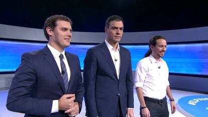 Los candidatos Pedro Sánchez, Albert Rivera y Pablo Iglesias posan junto al periodista de EL PAÍS y moderador del debate Carlos de Vega para la foto previa al debate
