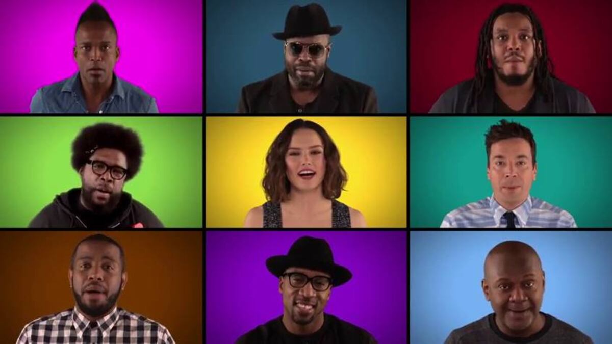Los robots de la película Star Wars, los soldados imperiales y hasta Chewbacca han cantado a capela la canción de la película El despertar de la fuerza, del compositor John Williams. A ellos se les han unido el reparto del séptimo episodio de la saga de George Lucas, que se estrena este viernes. El resultado es un original vídeo en el que aparecen los actores Adam Driver, Harrison Ford y Carrie Fisher, entre otros. El vídeo, que se emitió este martes en el programa televisivo estadounidense de Jimmy Fallon, contó con la colaboración del propio presentador, el grupo de rap estadounidense The Roots y otros rostros conocidos, como el de la actriz ganadora de un Oscar, Lupita Nyong'o.