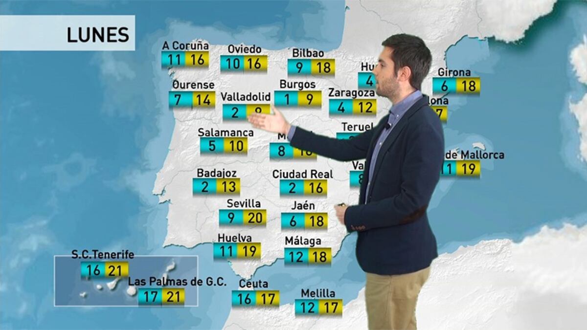 El primer día de la semana y el último del otoño estará dominado por algunas nubes pero lloverá muy poco en los próximos días. Habrá nieblas en los valles del Ebro y del Duero y en el suroeste de la península. En Canarias, el tiempo será inestable y habrá leves chubascos en el norte. Las temperaturas se mantienen estables hasta el día de Navidad y solo en la meseta norte descienden tímidamente. Las máximas oscilarán entre los 15 y 20 grados en la mayoría del país.