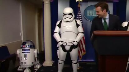 El jefe de prensa de la Casa Blanca, Josh Earnest, tuvo el pasado viernes una compañía especial: el robot R2-D2 acudió dispuesto a comparecer ante los medios y los soldados imperiales trabajaron como escoltas en su intervención en rueda de prensa en la casa del presidente, en Washington (EE UU). La sorpresa, que coincidió con el estreno en España de la séptima entrega de la saga de Star Wars, tuvo lugar con motivo de la proyección de El despertar de la fuerza, a la que estaban invitados los miembros de la fundación Gold Star families, una organización que protege a personas que han perdido a familiares en combates militares.