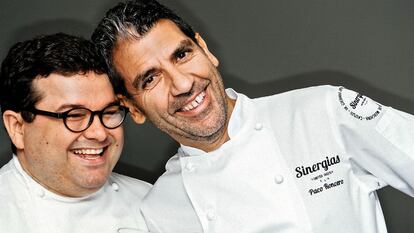 Del norte, con argumentos de tradición, basados en varias generaciones y un nuevo aire de vanguardia para revitalizar la cocina gallega y asturiana, llegan Pepe Solla y Marcos Morán. Renovando Madrid, tanto en los fogones del Casino como en sus gastrobares Estado Puro, Paco Roncero se ha unido en curiosa armonía con los otros dos chefs. Los tres han creado, dentro de ese teatro gastronómico que es Platea, la propuesta Sinergias. Y es ahí donde reciben a El País Semanal para elaborar un menú para Nochevieja.