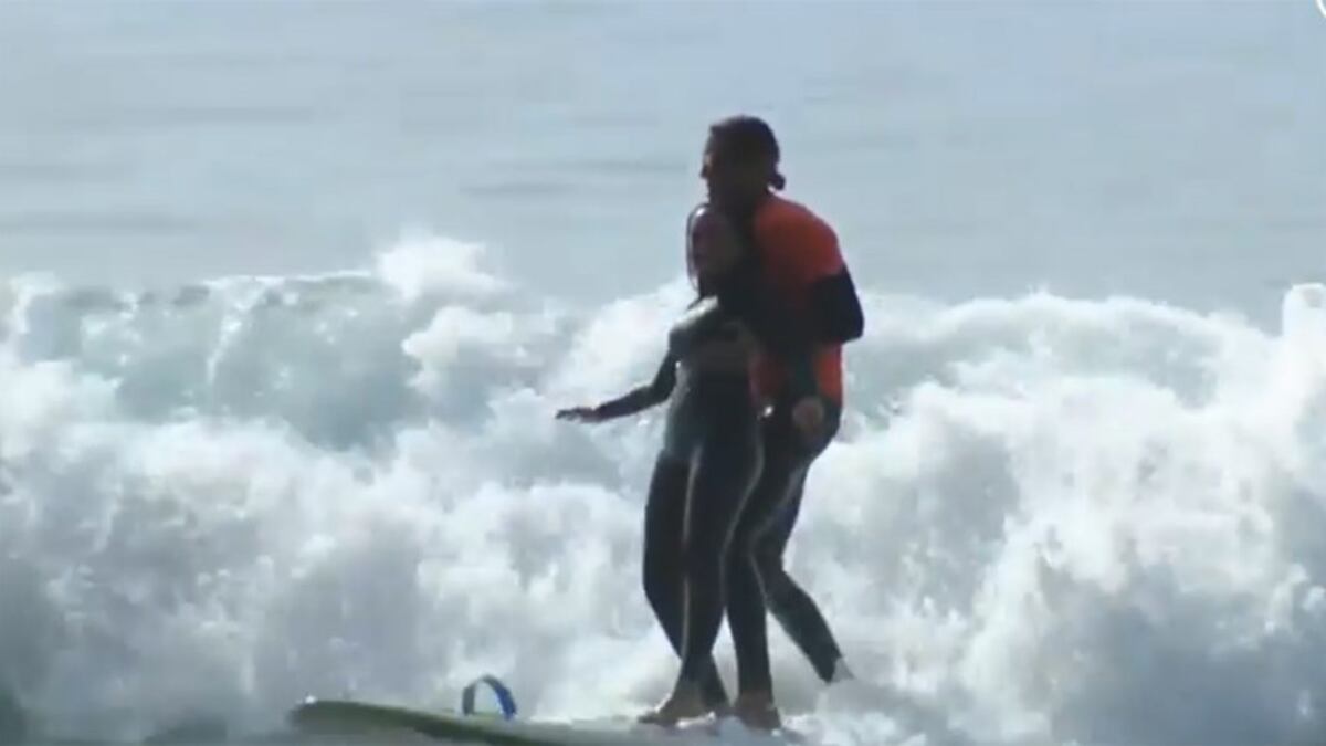 La activista por los derechos de los discapacitados Haben Girma se sube a una tabla de surf para demostrar que no existen barreras