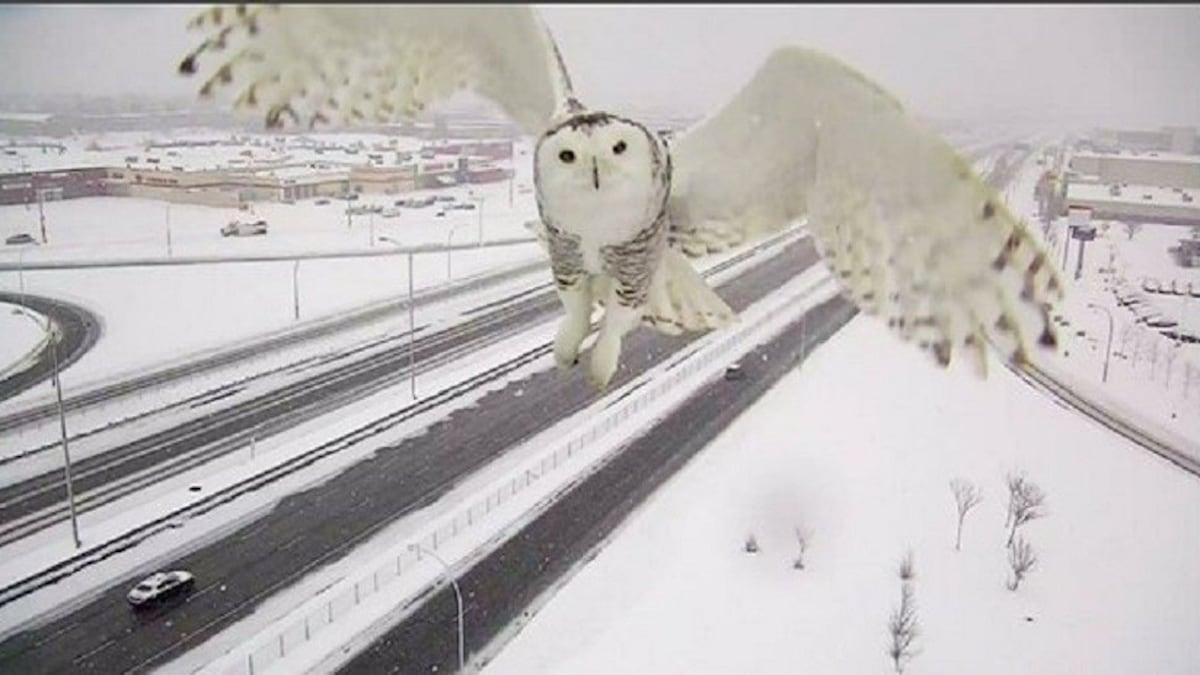 Una cámara capta a ‘Hedwig’ volando sobre las carreteras nevadas de Canadá
