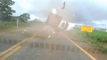 Un vídeo grabado el pasado 17 de enero muestra el accidente de tráfico de una furgoneta que gira diez veces sobre sí misma en una carretera del estado de Goias (Brasil). El impacto, captado por otro conductor, provocó que el copiloto saliera volando por la ventana aunque, pese al impacto, solo se fracturó una pierna y algunos huesos. El conductor dio positivo en la prueba de alcoholemia.