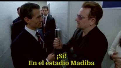 El presidente mexicano, Enrique Peña Nieto, se encuentra tras bambalinas con el cantante irlandés Bono en el Foro Económico de Davos, Suiza
