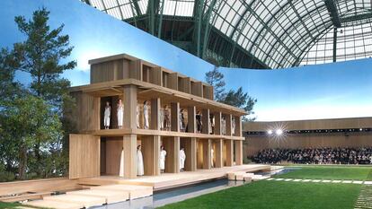 ¿Existe la eco-couture? Karl Lagerfeld quiere hacernos pensar que sí. O, al menos, los responsables de anunciar de qué iba el desfile de alta costura de Chanel antes de que se oficiara este martes en el Grand Palais de París. “Habrá guiños a lo natural, detalles de madera, corcho en las cuñas de los zapatos…”, deslizaban como quien desclasifica información confidencial. Después la cosa no fue para tanto… en lo que se refiere a lo ecológico. En lo demás, el káiser de la moda orquestó un espectáculo impecable con una puesta en escena más minimalista de lo que acostumbra: una casa de tablas de madera nórdica al estilo de Alvar Aalto con un jardín desnudo por cuyas tablas vimos largos midi, siluetas longilíneas en contraste con volúmenes en faldas y, como novedad, mangas supertrabajadas en patronaje y texturas.