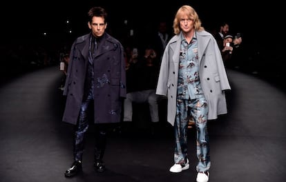 Los traspiés de Derek Zoolander, el modelo bobo y adorable que encarna Stiller, han reclutado una buena legión de admiradores en este tiempo. Como cualquier chiste, fracasa en cuanto se intenta explicar. A pesar de ello, y por mucho que la trama esté ya muy bien resumida en Wikipedia, deje que le pongamos en antecedentes. En la cinta original, Zoolander reina en el universo de los modelos masculinos gracias a sus tres miradas (Ferrari, Le Tigre y Acero Azul, básicamente iguales), pero vive horas bajas por culpa de su rival en ascenso, Hansel (encarnado por Owen Wilson). Conocedores de sus pocas luces, un malvado grupo de diseñadores, encabezado por Mugatu (Will Ferrell), le lava el cerebro en un laboratorio camuflado como un spa: pretenden conseguir que el supermodelo utilice su atlética forma física para asesinar al primer ministro de Malasia, invitado de honor al desfile de Mugatu e incómodo abogado de lo único que puede hacer tambalearse a la industria de la moda: la abolición del trabajo infantil.